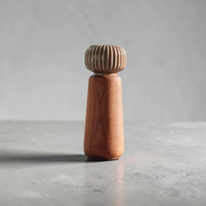 Kähler Hammershøi kværn 18 cm i brun fremstår med et elegant og mere markant udtryk i den højere model. De ikoniske riller tilfører struktur, mens kombinationen af glaseret keramik og olieret egetræ skaber en harmonisk balance mellem det klassiske og det moderne.