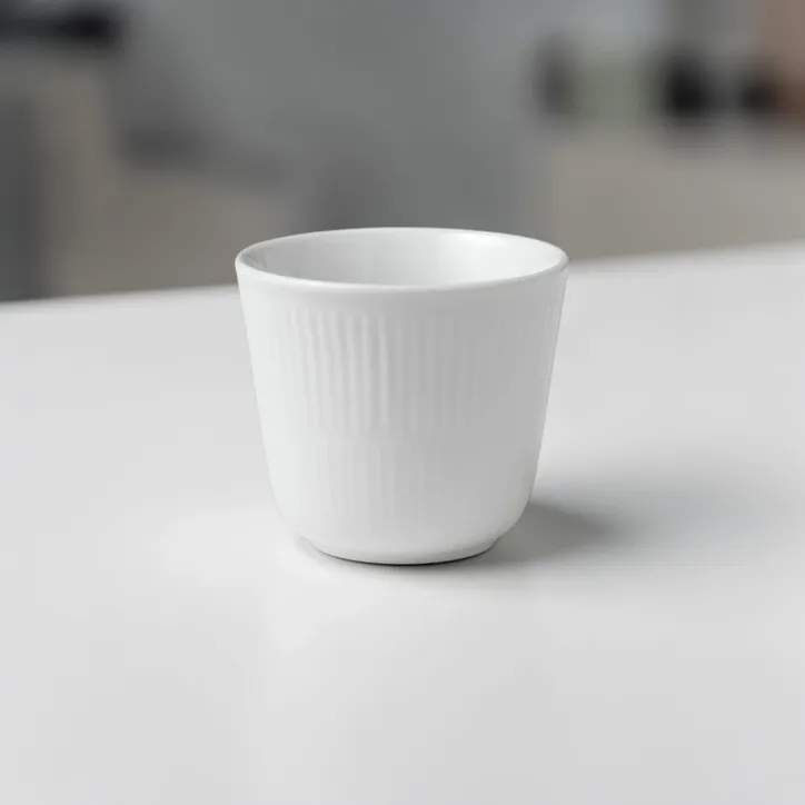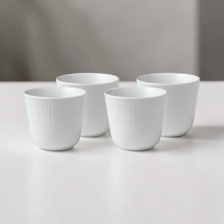 Fire termokrus i Royal Copenhagens Hvid Riflet-design, udført i porcelæn med taktile rifler og klassisk elegance.
