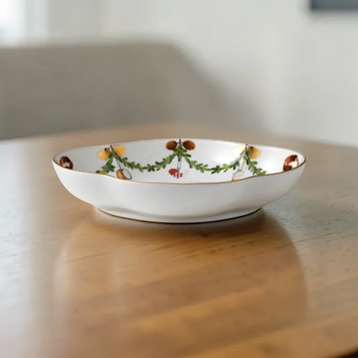 Elegant porcelænsfad dekoreret med Stjerne Riflet Jul-motivet, der kombinerer klassiske rifler med fine, håndmalede detaljer.