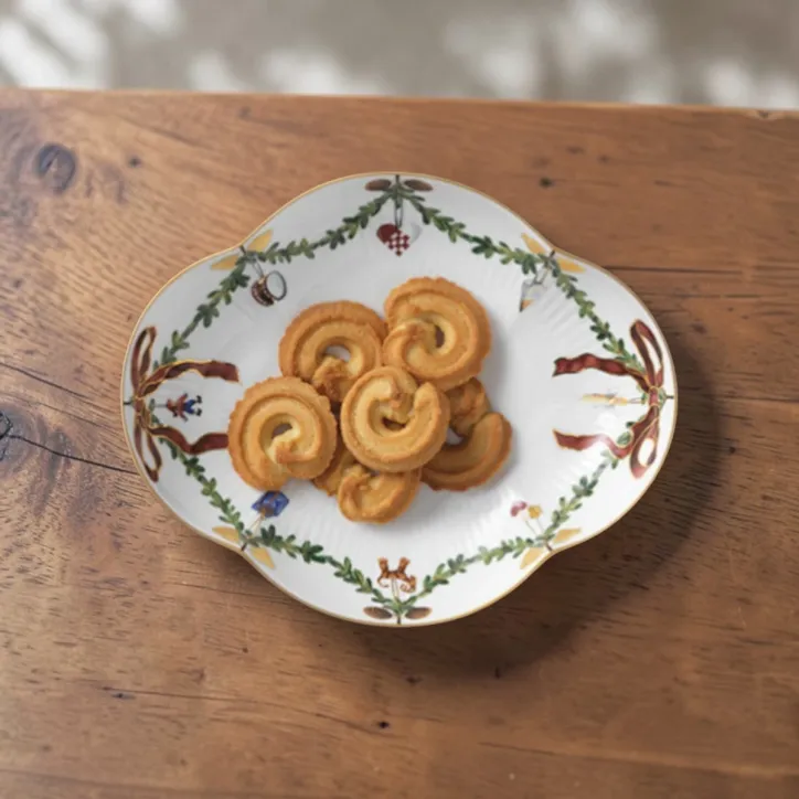 Stjerne Riflet Jul fad i 22 cm har en alsidig mellem-størrelse, der gør den oplagt til juletidens søde serveringer eller som en lille sidetallerken til tilbehør. Som enhver anden steldel i Stjerne Riflet Jul er fadet udsmykket med sit eget udvalg af julepynt. Blandt julens smukke traditioner hører julestellet fra Royal Copenhagen. På tallerkener, skåle og kopper snor granguirlanderne sig højtideligt, dekoreret med elegante silkesløjfer og den fineste julepynt. Stjerne Riflet Jul skaber stemning og gør julen til noget helt særligt – generation efter generation. Hver eneste steldel er et smukt stykke julepynt i sig selv, og når bordet står dækket og lysene er tændt, så bliver det helt sikkert jul igen.