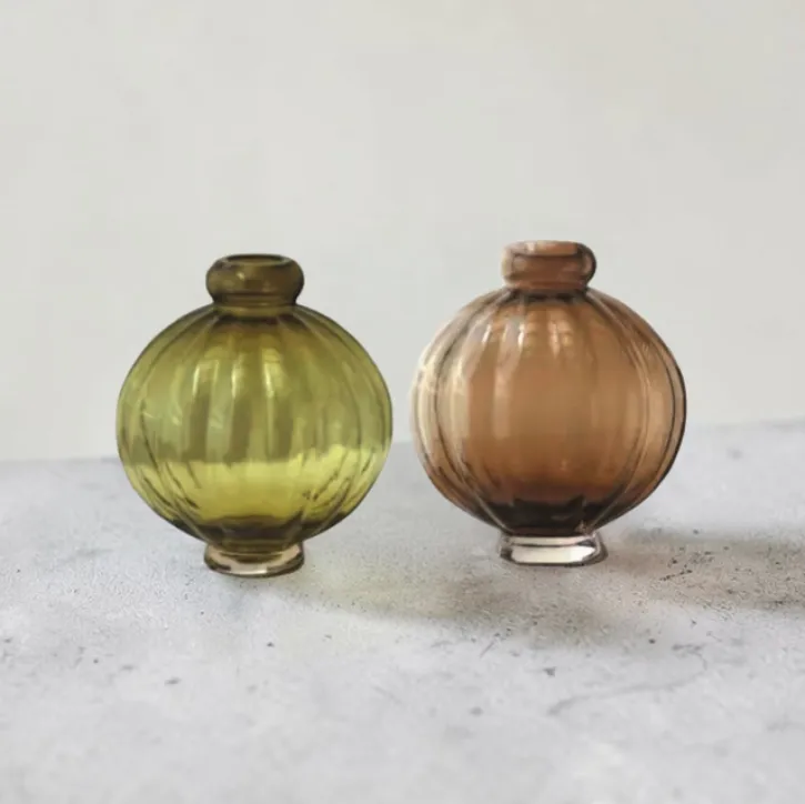 Balloon Vase 01 fås i to afstemte farver: olive – en varm, naturinspireret tone, der tilføjer dybde og ro – samt smoke, som med sin røgfarvede transparens giver et afdæmpet og stilrent udtryk. Uanset valg af farve, tilføjer vasen en diskret luksus til enhver indretning.