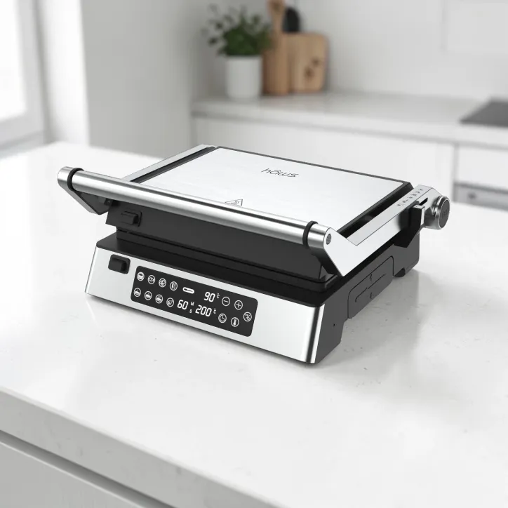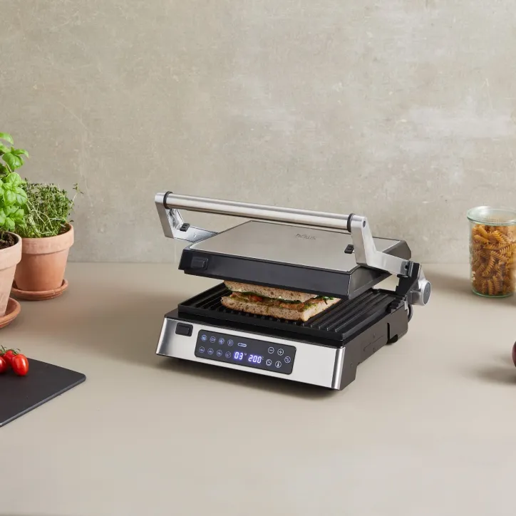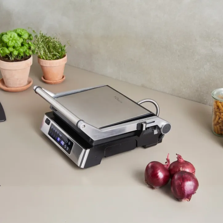 Kraftfuld bord- og paninigrill med PFAS-fri belægning, aftagelige plader og præcis styring via digitalt termometer.