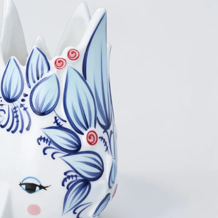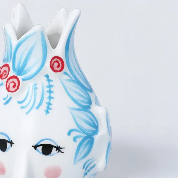 Bjørn Wiinblad Titania-sættet samler tre dekorative elementer fra den karakteristiske serie med skulpturelle former og håndmalede detaljer. Den høje vase og de to kronelysestager fremstår i en lys blå nuance, som understreger seriens poetiske og kunstneriske udtryk.